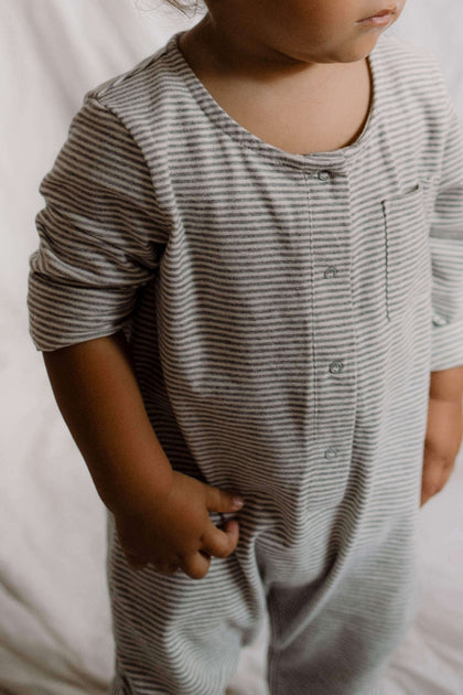 Een jersey babypakje met lange mouwen, gemaakt van ons zachtste, biologische katoen. Om het perfect te laten aansluiten, is er in de jerseystof een klein beetje elestan verwerkt. Op de voorzijde van het pakje zit een zichtbare sluiting van drukknopen en een zakje op de borst aan de rechterkant. Tussen de beentjes zit een drukknoopsluiting voor het gemakkelijk verschonen van je kindje