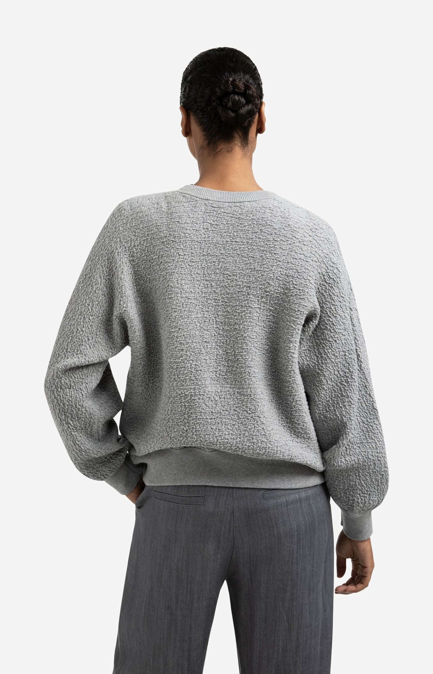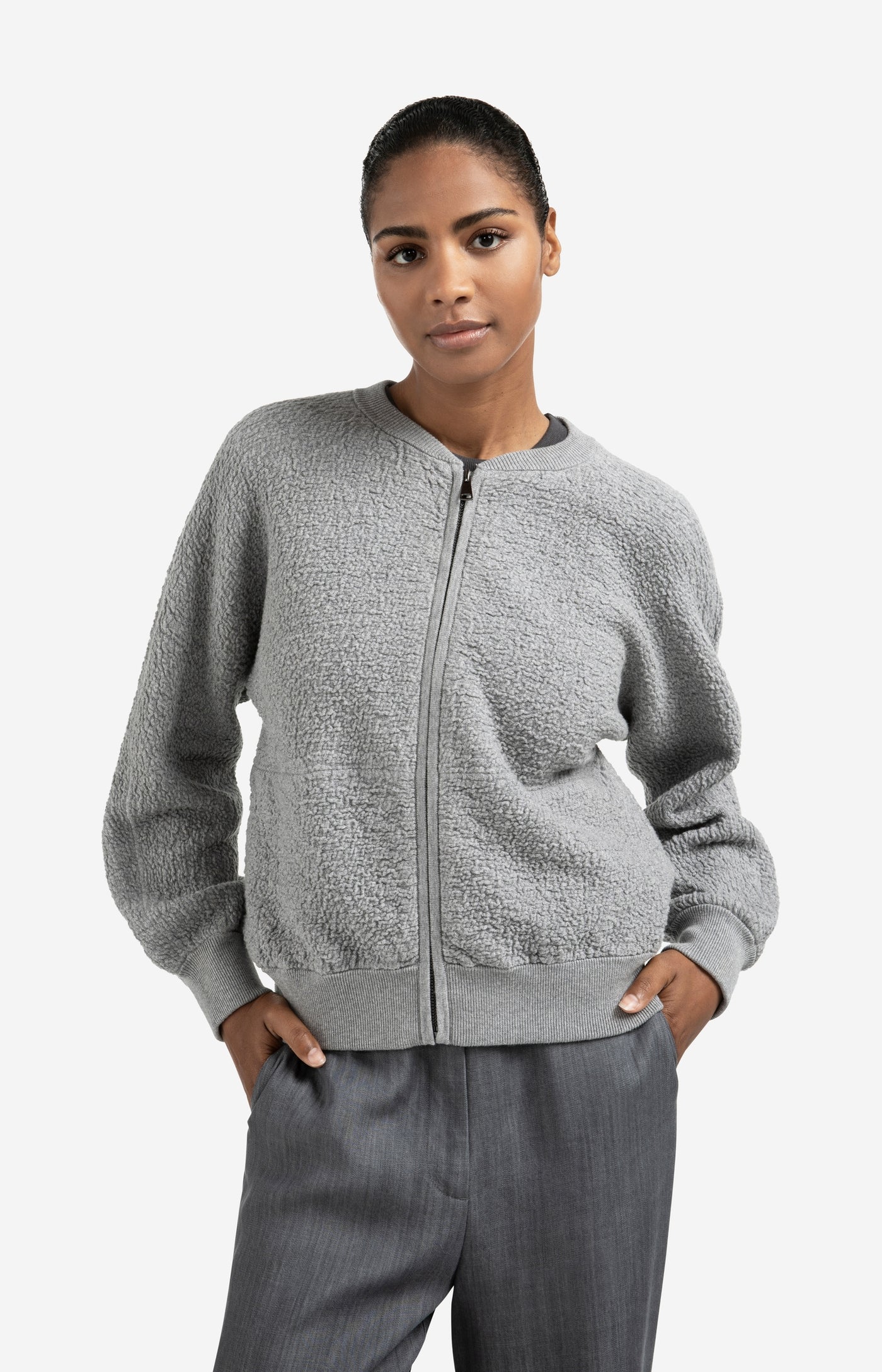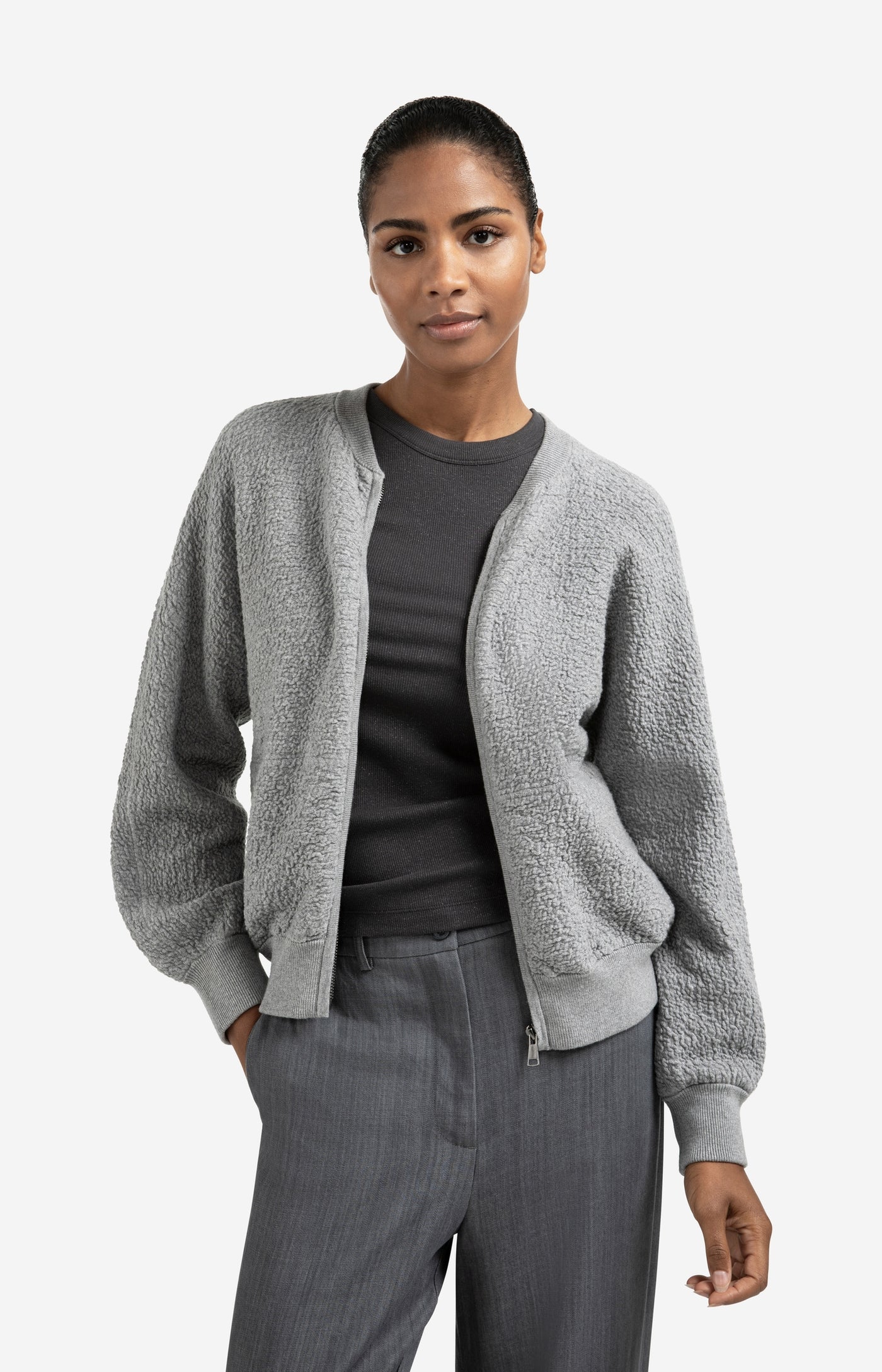 Deze comfortabele bomber is gemaakt van een zachte gebreide stof met een rijke structuur. Het model heeft lange mouwen, een losse pasvorm en een ritssluiting. De ribboorden aan de mouwen en zoom zorgen voor een sportieve touch. Een perfect item om je look een casual en moderne uitstraling te geven.