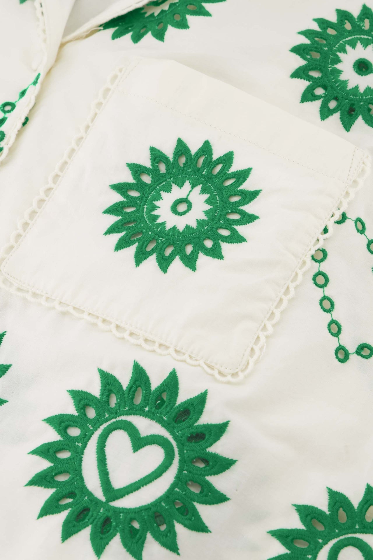 De Brielle-blouse is een luchtig item met gedetailleerde groene borduursels en een speelse geschulpte rand. Perfect voor warme dagen en makkelijk te combineren met de Cari-rok voor een elegante zomerse look.