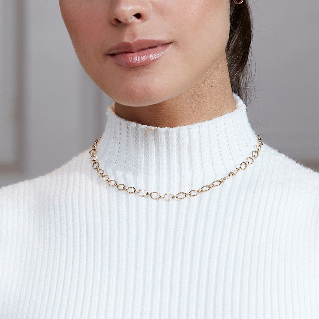 De Carreau chain heeft mooie geribbelde platte schakels die aan kleine ovale schakels zijn gekoppeld. Je kunt de Carreau ketting dragen zoals hij is of een van onze hangertjes bevestigen met behulp van spring rings. Creëer een persoonlijke ketting voor jezelf of om cadeau te doen. Hier is Carreau te zien in een glanzende 14K vergulding.