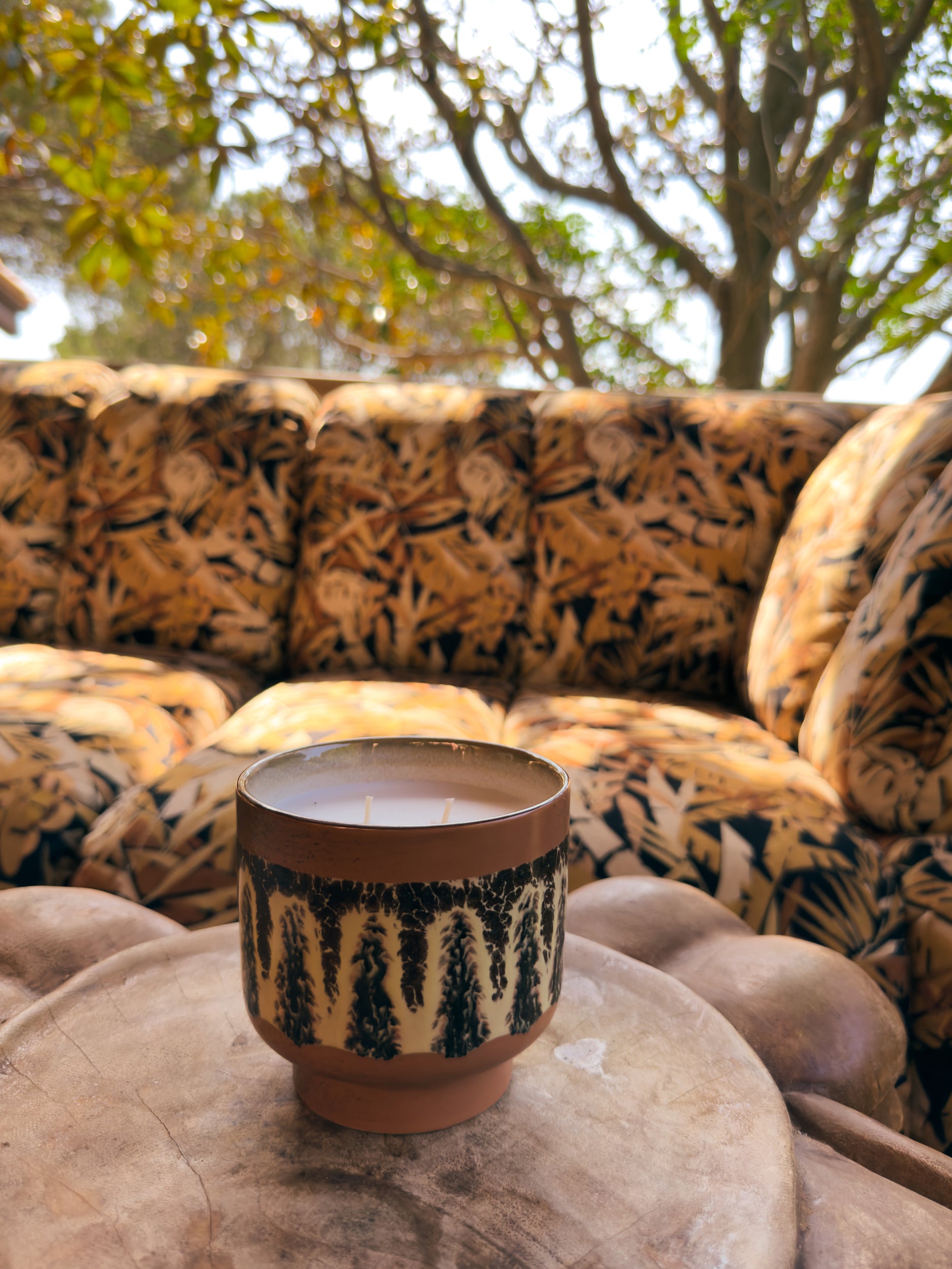 Geurkaars van het merk HKLiving. Een prachtige kaars in 70s stijl. De kaars heeft een katoenen lont en een keramieken omhulsel. De kaars heeft de geur van warme sinaasappel, lichte jasmijn en bloeiende muskus. De kaars heeft 2 lonten wat extra veel sfeer geeft in jouw ruimte.