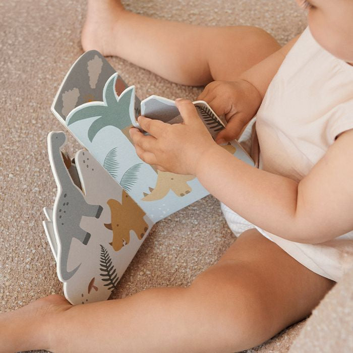 Wie gluurt daar naar buiten? Het Jade boekje van Liewood is een zintuiglijke leeservaring voor nieuwsgierig kindjes die dol zijn op dinosaurussen.Elke pagina is anders gevormd waardoor het lijkt alsof de afbeeldingen tot leven komen, dit zorgt voor een extra levendige leeservaring. Het kartonnen boekje is gemaakt van zwaar 100% FSC-gecertificeerd papier.
