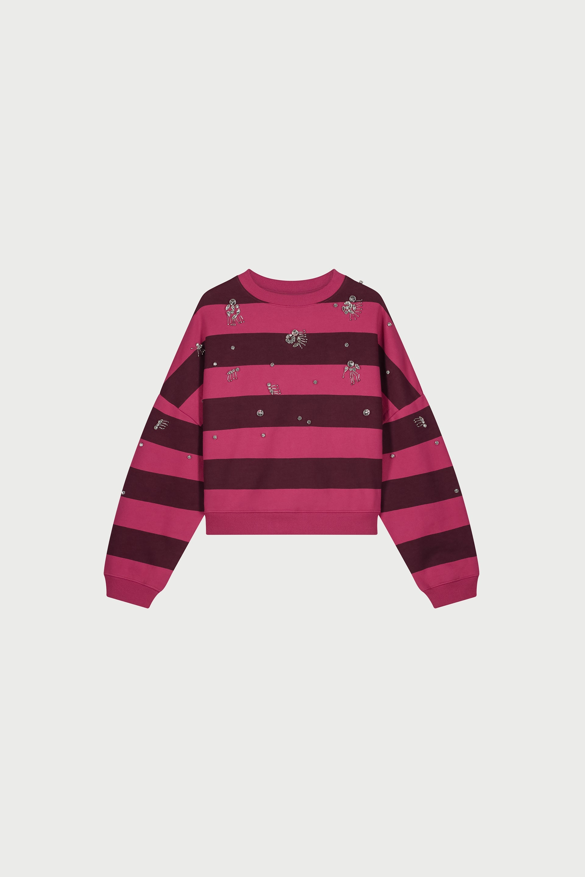 De gestreepte sweater in roze met donkerrode strepen geeft je outfit een frisse, speelse uitstraling. Gemaakt van 100% biologisch katoen, licht en ademend, ideaal om in elk seizoen te layeren. Draag casual met denim of combineer met relaxed tailoring voor een slimme off-duty stijl.