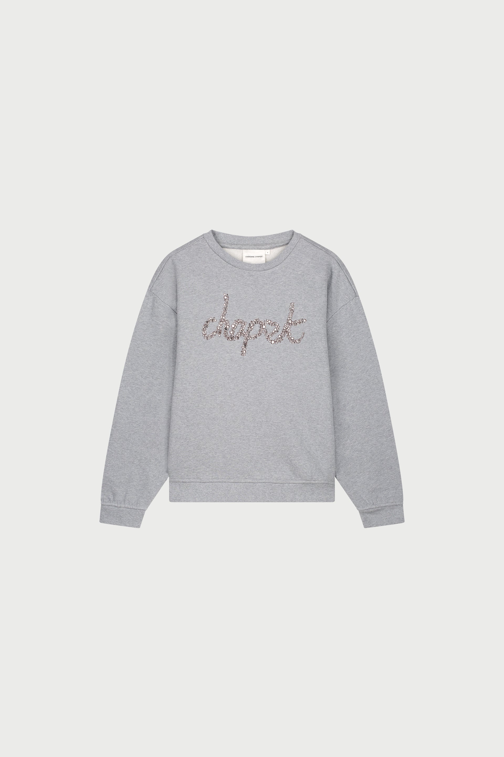 Deze grijze trui is gemaakt van biologisch katoen en heeft een relaxt model met speelse strass-lettering, een frisse twist op een klassieker. Perfect voor cosy dagen thuis, casual uitstapjes of om je dagelijkse look een vrolijke toevoeging te geven.