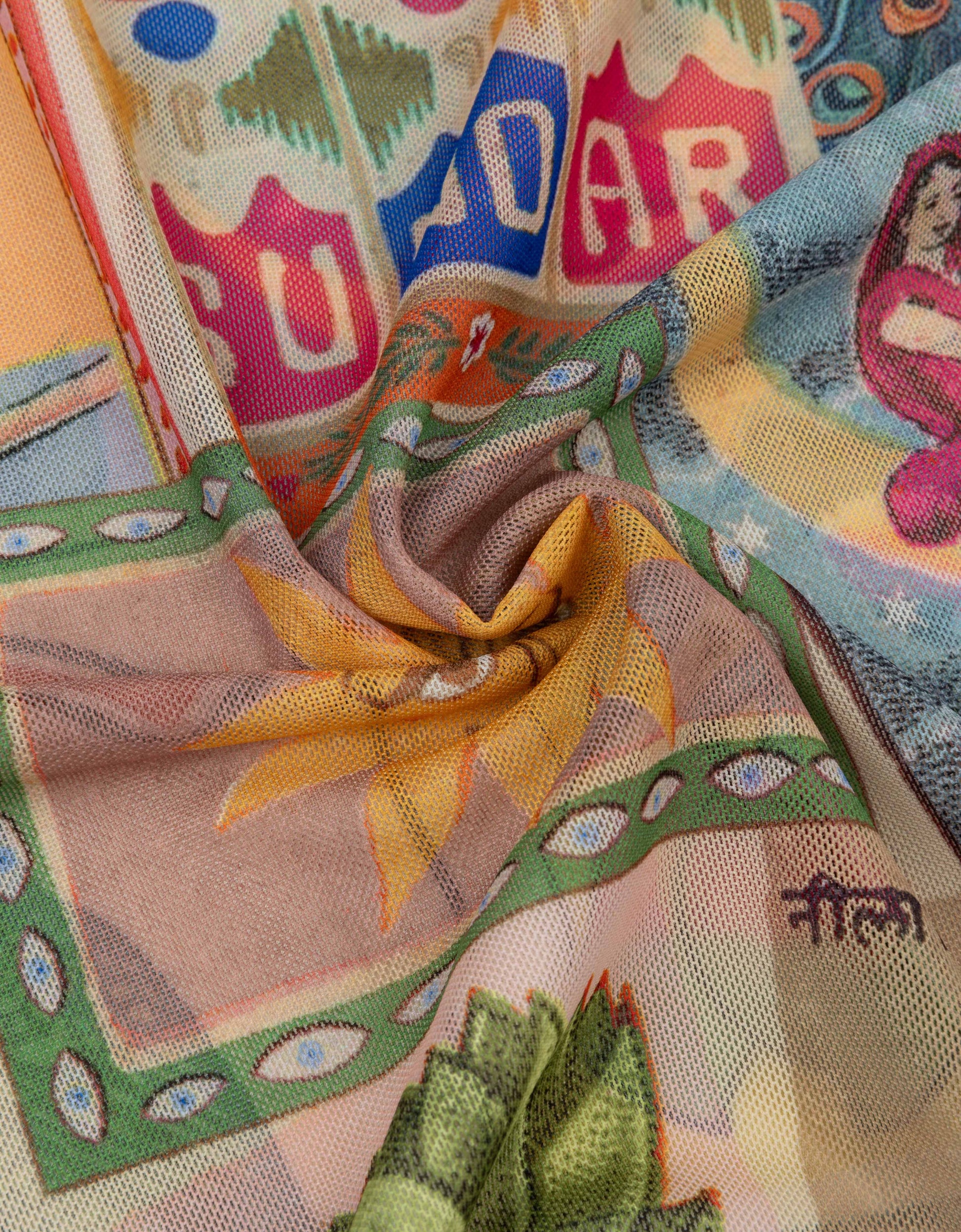 Deze licht transparante, getailleerde meshtop is zacht, comfortabel en voorzien van een kleurrijke print geïnspireerd op Indiase luciferdoosjes. De placement van de print verschilt per item, dus elk tshirt is uniek. -94% CRS-gecertificeerd gerecycled polyester, 6% Elastane -Licht doorschijnend -Getailleerd