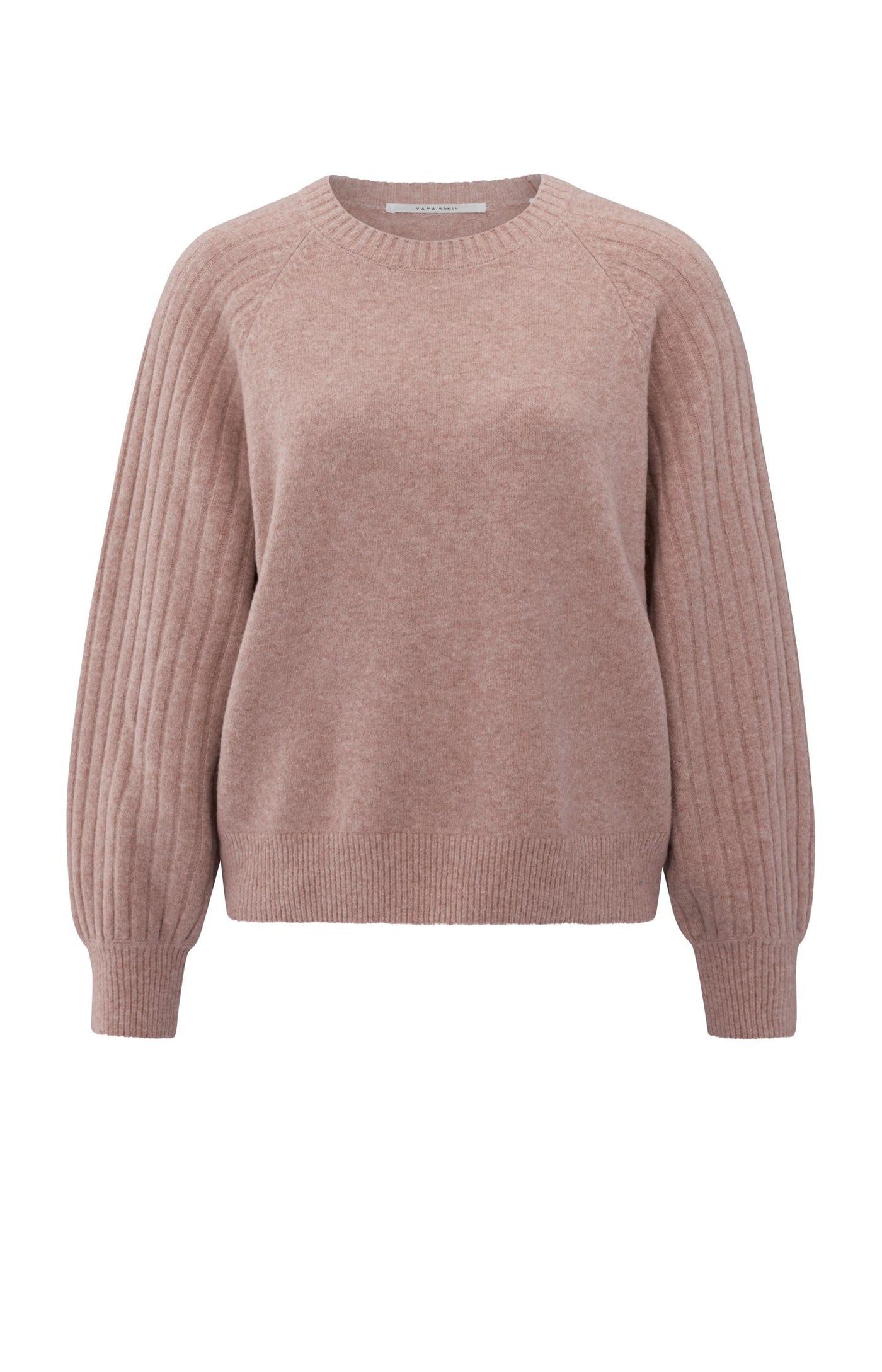 Deze zachte trui is ontworpen met een ronde hals en lange, ribgebreide mouwen die een speels contrast geven met het gladgebreide lijf. De verlaagde schoudernaden en losse pasvorm zorgen voor een ontspannen, vrouwelijke look. Afgewerkt met brede boorden aan de zoom en manchetten voor extra comfort en stijl. Perfect voor een cozy en moderne outfit.