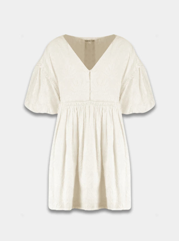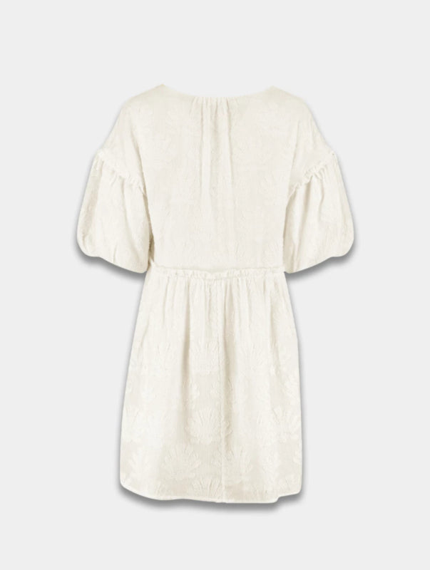"Dream away in our YARA dress! De YARA jurk heeft een oversized balloon fit met pofmouwen. Aan de voorzijde heeft de jurk een subtiele v-hals met daaronder 3 knoopjes. Rondom de taille zit een kleine ruche, little cuteness! De overall schelpen print is een 'magical escape'.